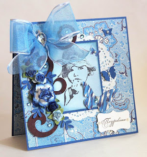При создании открытки я использовала бумагу коллекции Willow синих оттенков, а именно листы: такой и такой; штамп от Paperbagstudio, глиммер мист Fall Breeze, дырокольные веточки и бабочки, салфеточку, ленту из органзы, брадс с голубым кристаллом (LM), завиток из чипборда, розочки синих оттенков (Prima и др.), половинки жемчужин и акриловые капли. Надпись - штамп (Питерский Скрапклуб).
