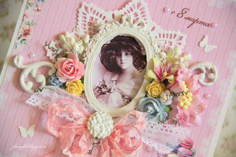 Бумага из коллекции из коллекции "Полуденный чай", объемный розовый цветок, половинки жемчужин, шебби-лента - все Scrapberry's.