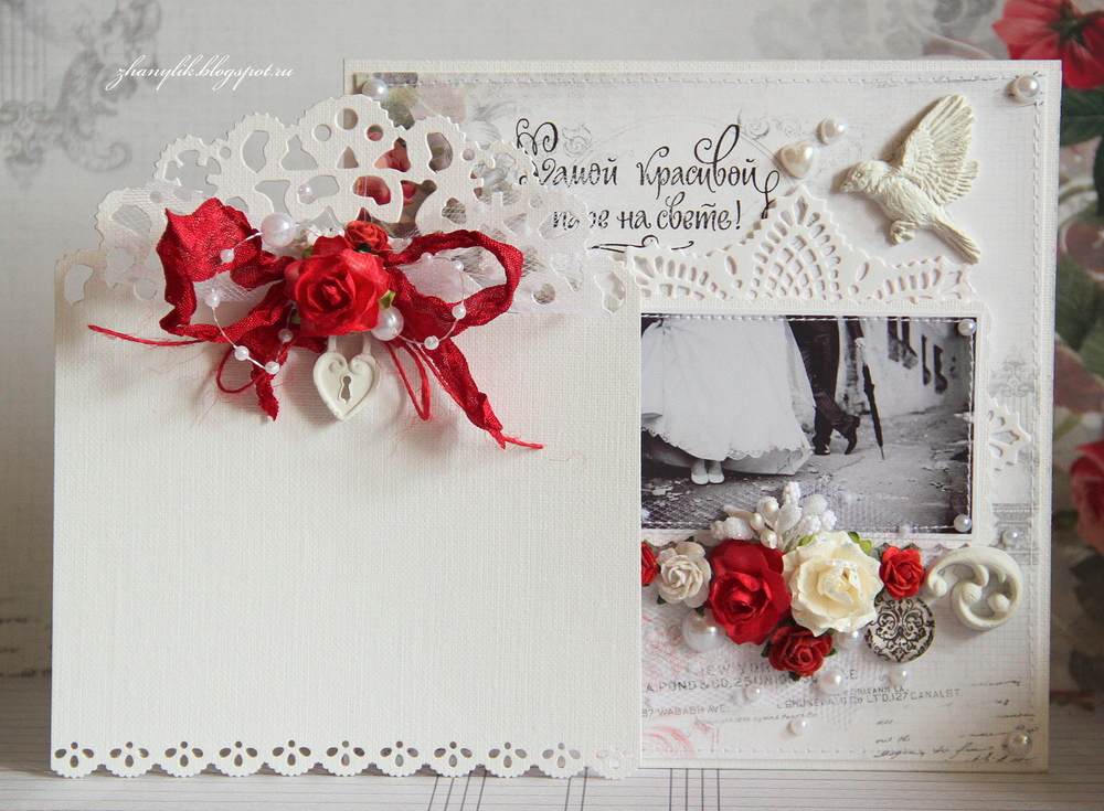 Для открытки использовала бумагу galeria papieru, салфеточку, розочки, листики, тычинки, шебби-ленту, декоративные ягодки, половинки жемчужин, гипсовые фигурки, цифры-наклейки, надпись - штамп (Питерский Скрапклуб).